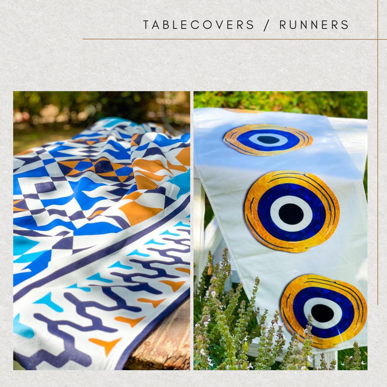 Our Tablecovers or Runners are all of designs that are in-house creates by our team or hand-painted Illustrations by our talented Artist Marianne Hanna , & patterns put together in design by Nada Moguib.