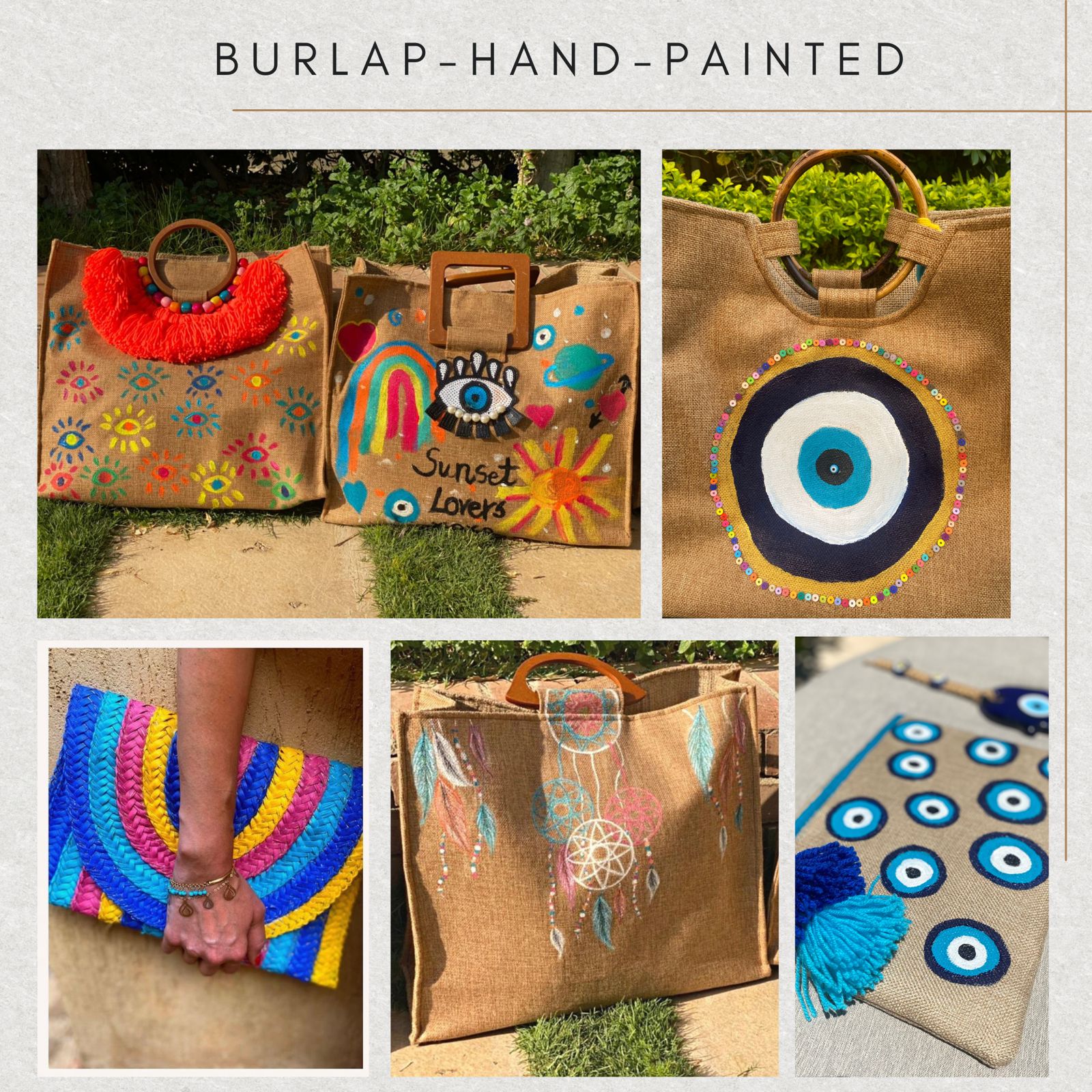 Our in-House Designs of Hand-Painted Burlap Pieces in different tote and pouch sizes!